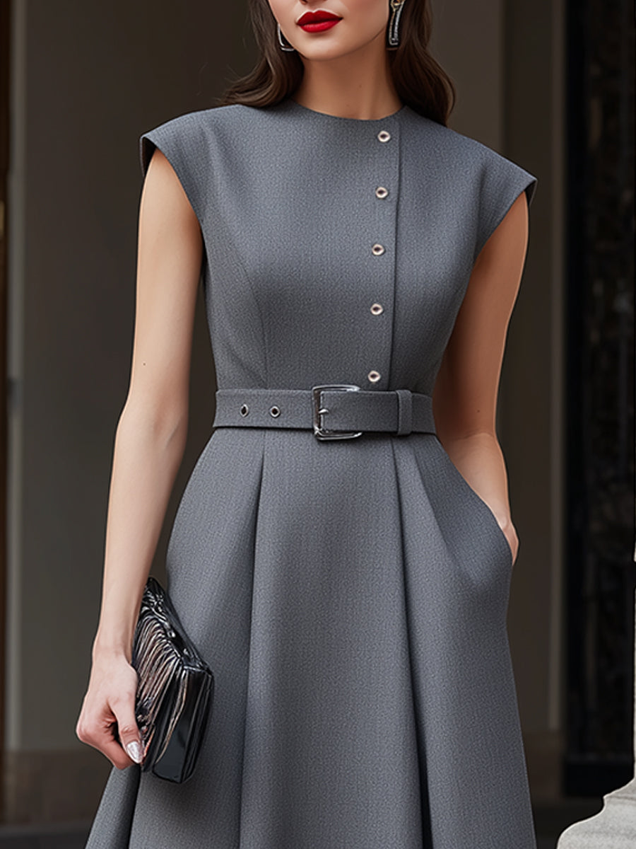 - Design: Sleeveless construction, front button detailing, belted waist, and softly pleated skirt for balanced structure and movement