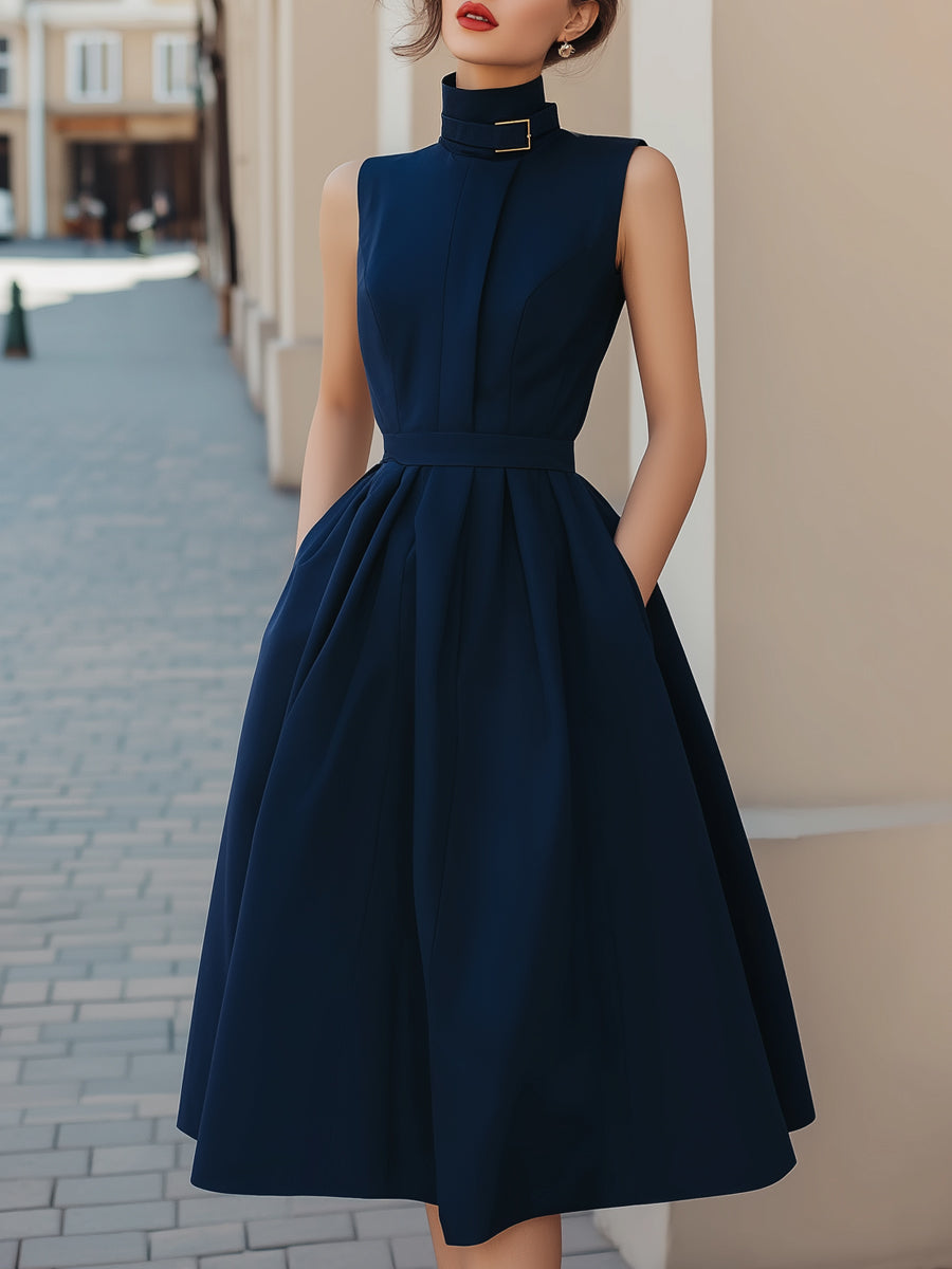 Belted High-Neck Sleeveless A-Line Dress