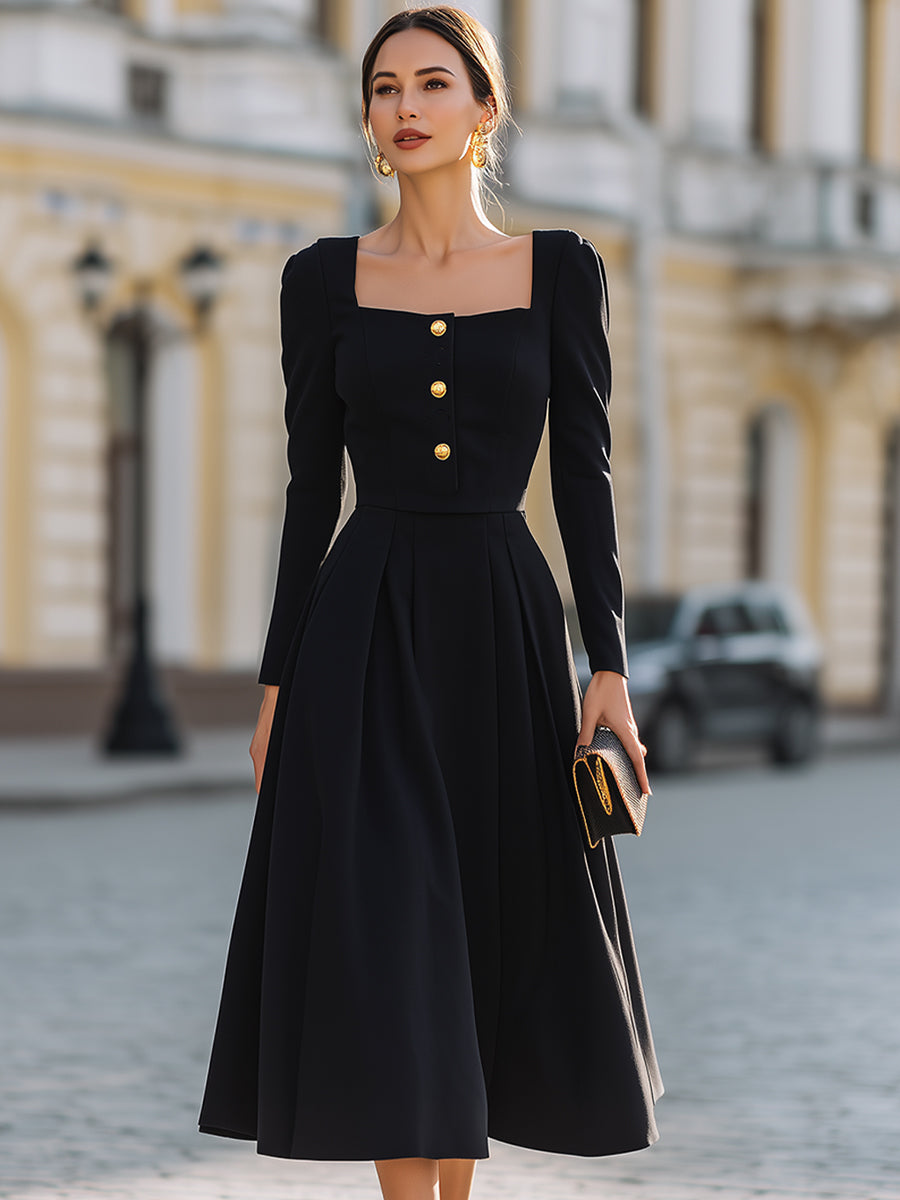 Black Square-Neck Long-Sleeve Midi Dress With Gold Buttons