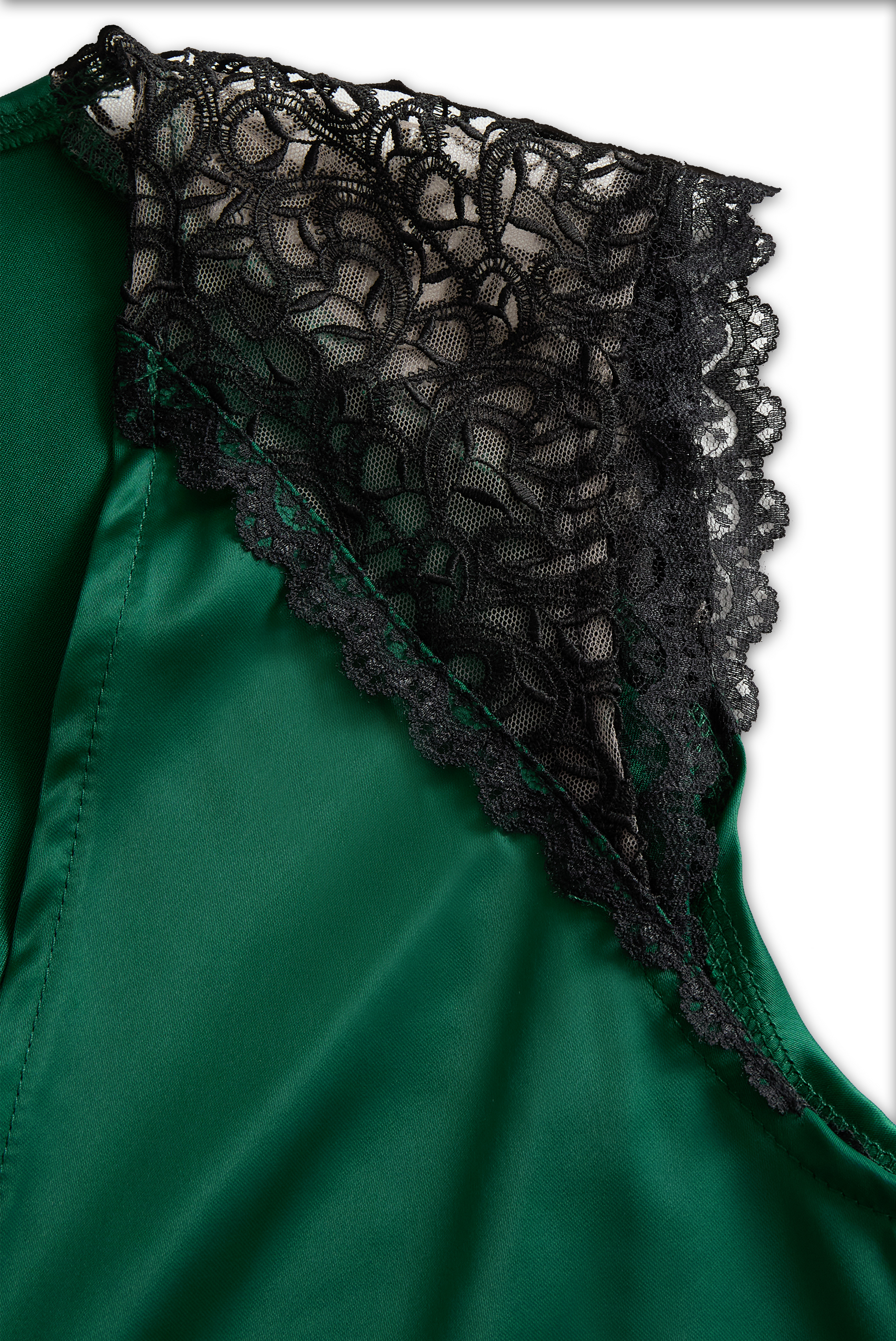 Deep V-Neck Satin Blouse with Lace Details - Emerald Allure