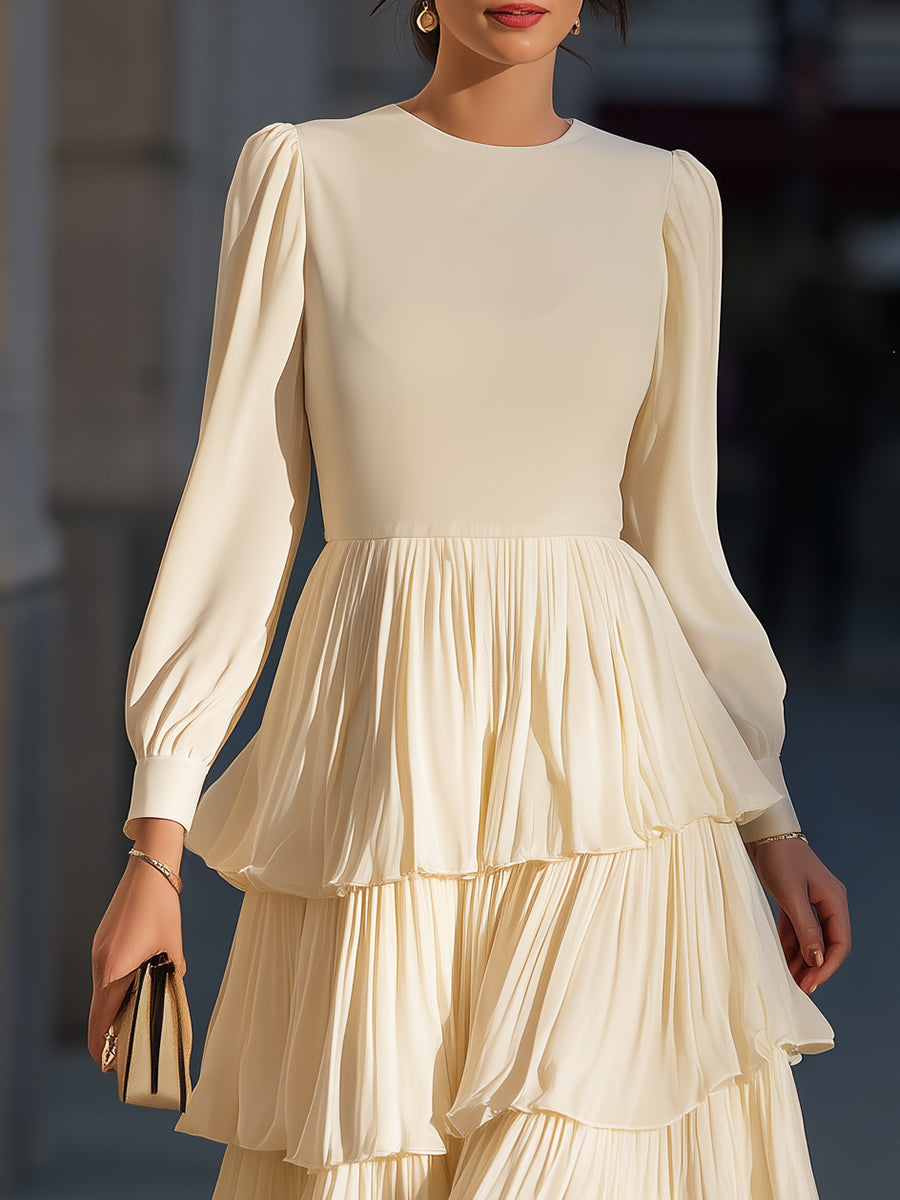 Perfect for embodying soft luxury, this dress merges structured sophistication (in the fitted bodice) with whimsical movement (from the layered pleated tiers). The satin-chiffon blend catches light gently, while the puffed sleeves add a romantic touch without feeling overly dramatic. Style it with delicate strappy heels and a compact clutch for a look that feels both elevated and effortlessly dreamy at any upscale, sunlit occasion.