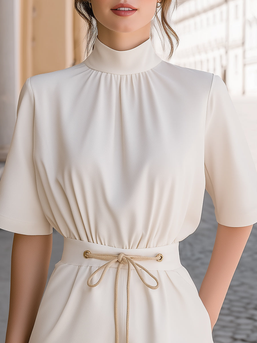 This high-neck dress offers a refined balance between softness and structure, designed to highlight effortless elegance with subtle detailing. The silhouette features a clean high neckline with gentle gathering at the front, creating natural drape across the bodice while maintaining a polished appearance. Short sleeves add a relaxed yet composed touch, making the design suitable for both warm-weather wear and transitional styling.