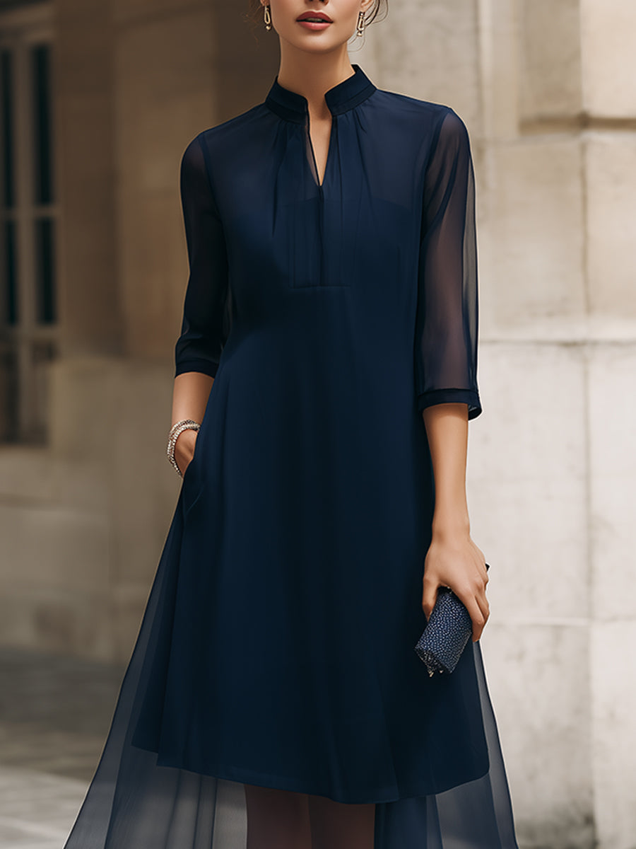 - Design: Mandarin collar with split neckline, semi-sheer three-quarter sleeves, layered sheer overlay, softly flared midi silhouette