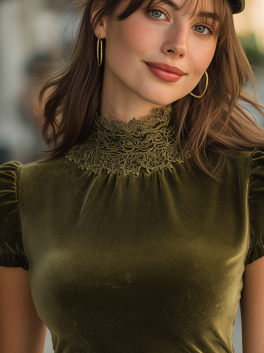 Puff Sleeves Velvet Lace-Trim High-Neck Top