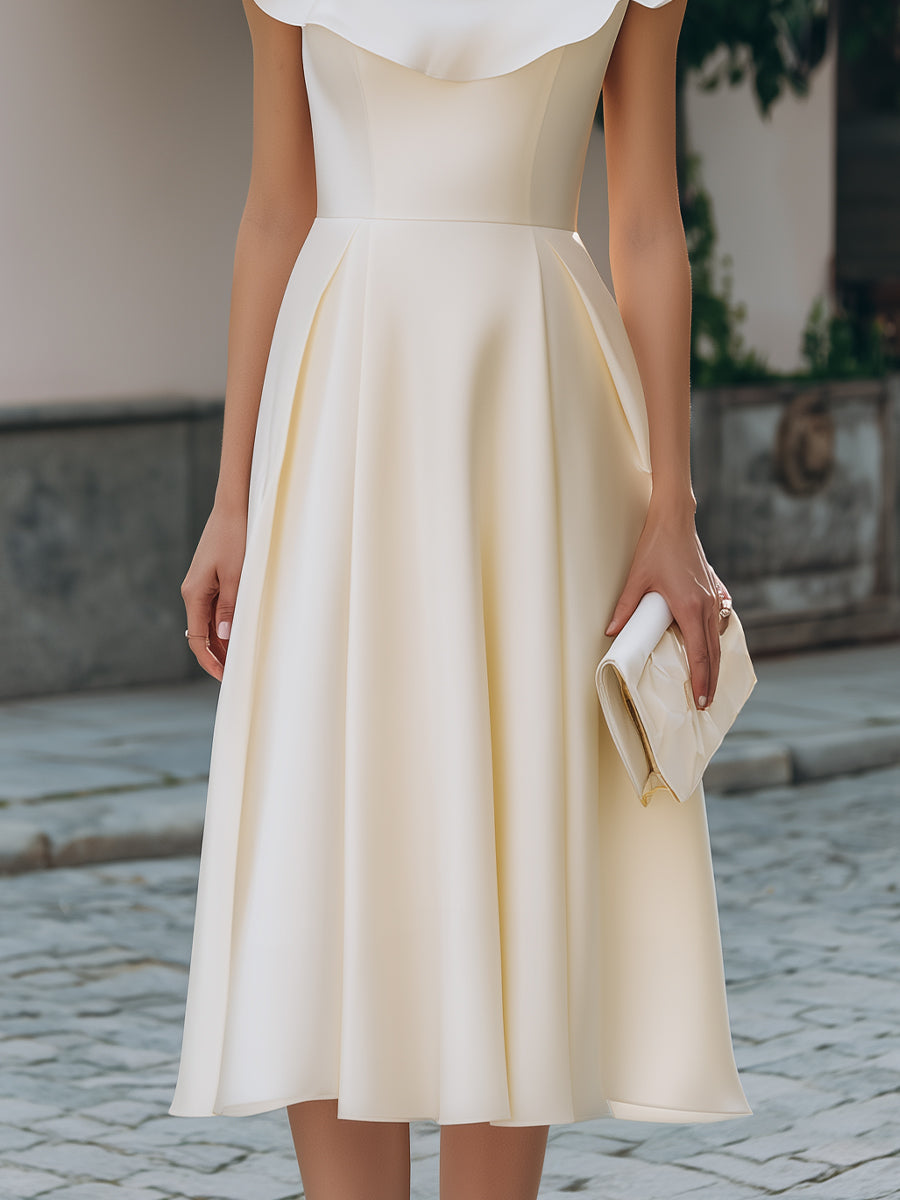 Ruffled Neckline Cap-Sleeve A-Line Midi Dress