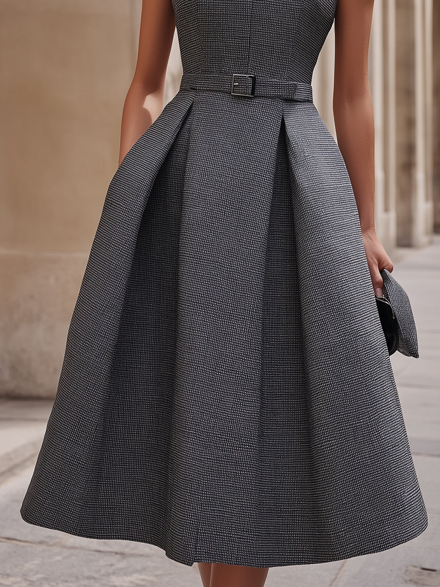 KSXTXX presents an elegant sleeveless midi dress that combines architectural tailoring with timeless femininity. Designed with a clean round neckline and a structured sleeveless bodice, this dress highlights refined lines and balanced proportions. The fitted upper silhouette gently defines the waist, enhanced by a slim coordinating belt that adds subtle structure without overpowering the design. Below the waist, the skirt opens into a graceful A-line shape with soft pleats, creating natural volume and fluid movement with every step. The midi-length hem offers a polished finish, making this piece ideal for sophisticated day-to-evening transitions. Thoughtfully crafted, the dress embodies understated luxury and modern versatility, reflecting KSXTXX¡¯ commitment to precise tailoring and elegant form.