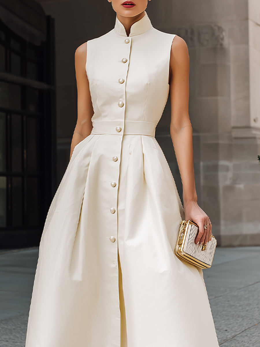 - Design: Sleeveless silhouette with mandarin collar, full button-front closure, defined waist seam, and softly pleated A-line midi skirt