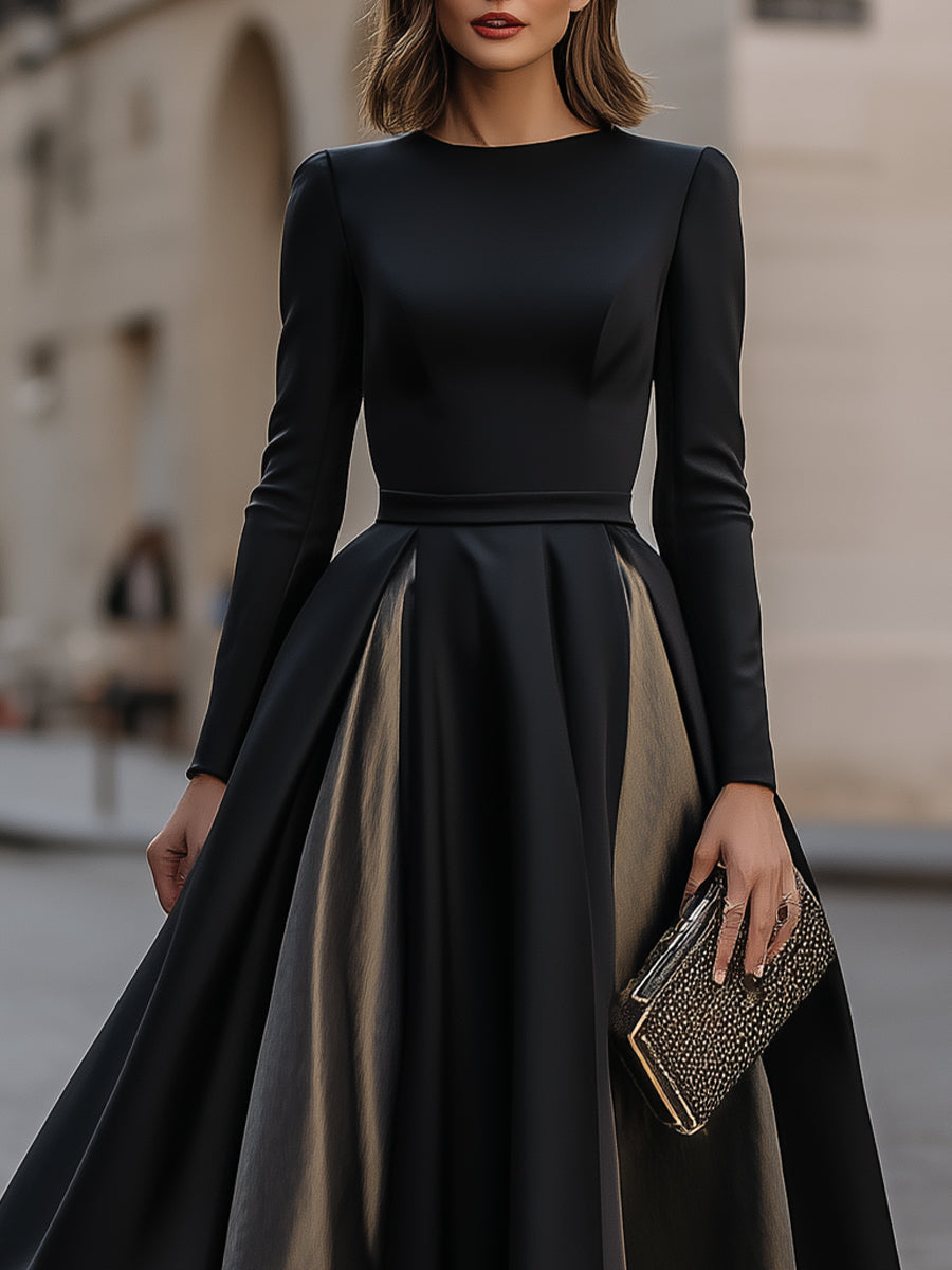 - Design: Round neckline, long sleeves, fitted bodice, defined waistline, full pleated skirt, midi-length hem