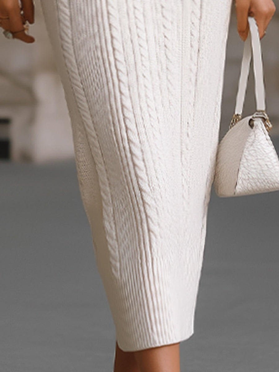 Elevate your wardrobe with a piece that radiates effortless elegance. This maxi dress reinterprets classic knitwear through a lens of high fashion. The centerpiece is the exquisite cable-motif craftsmanship that runs vertically down the dress, creating an illusion of height and grace.