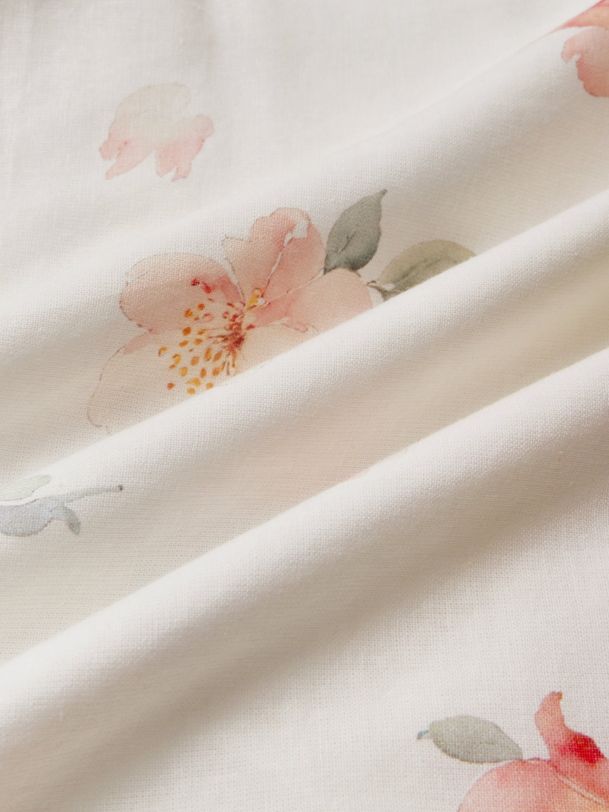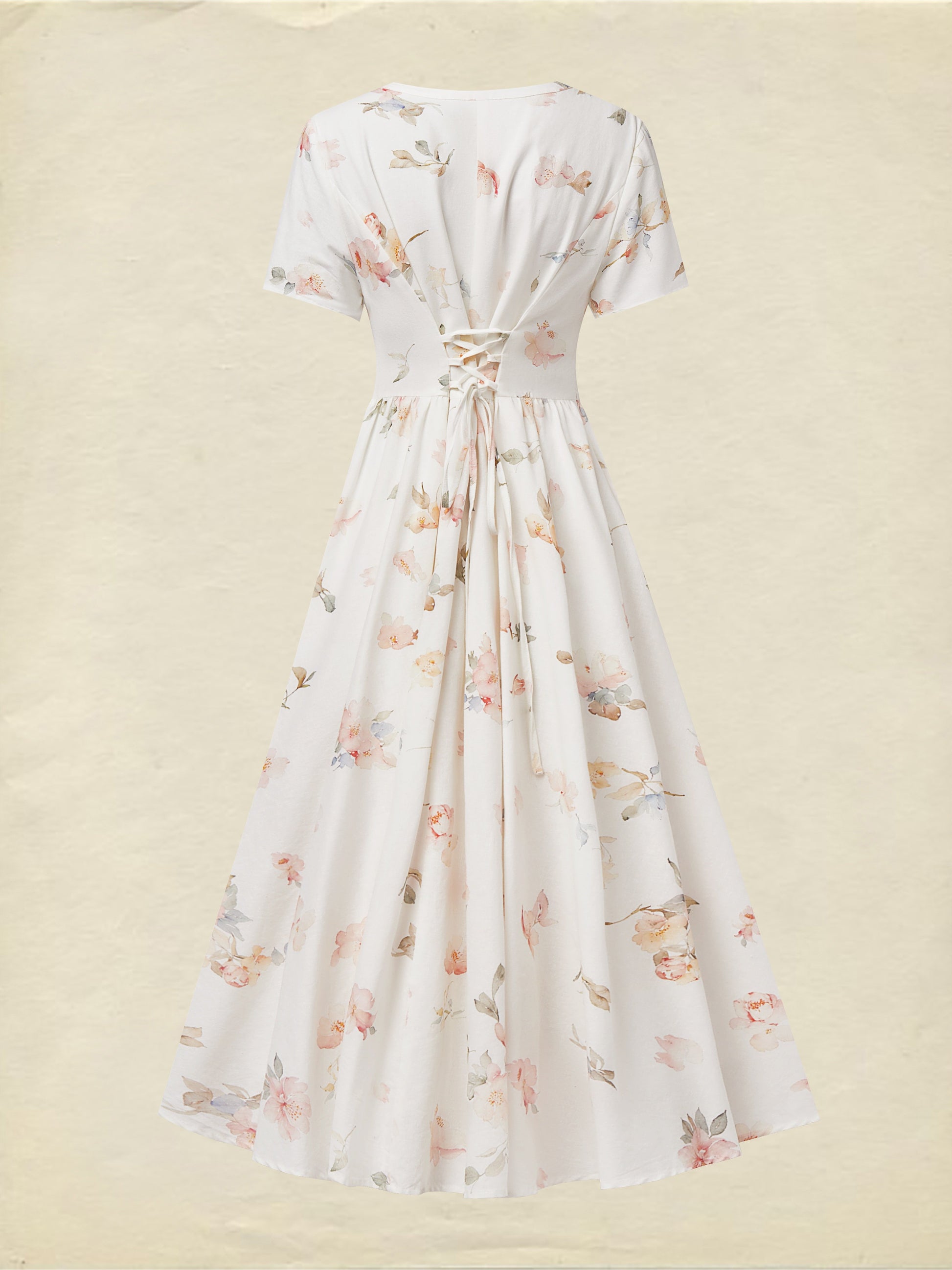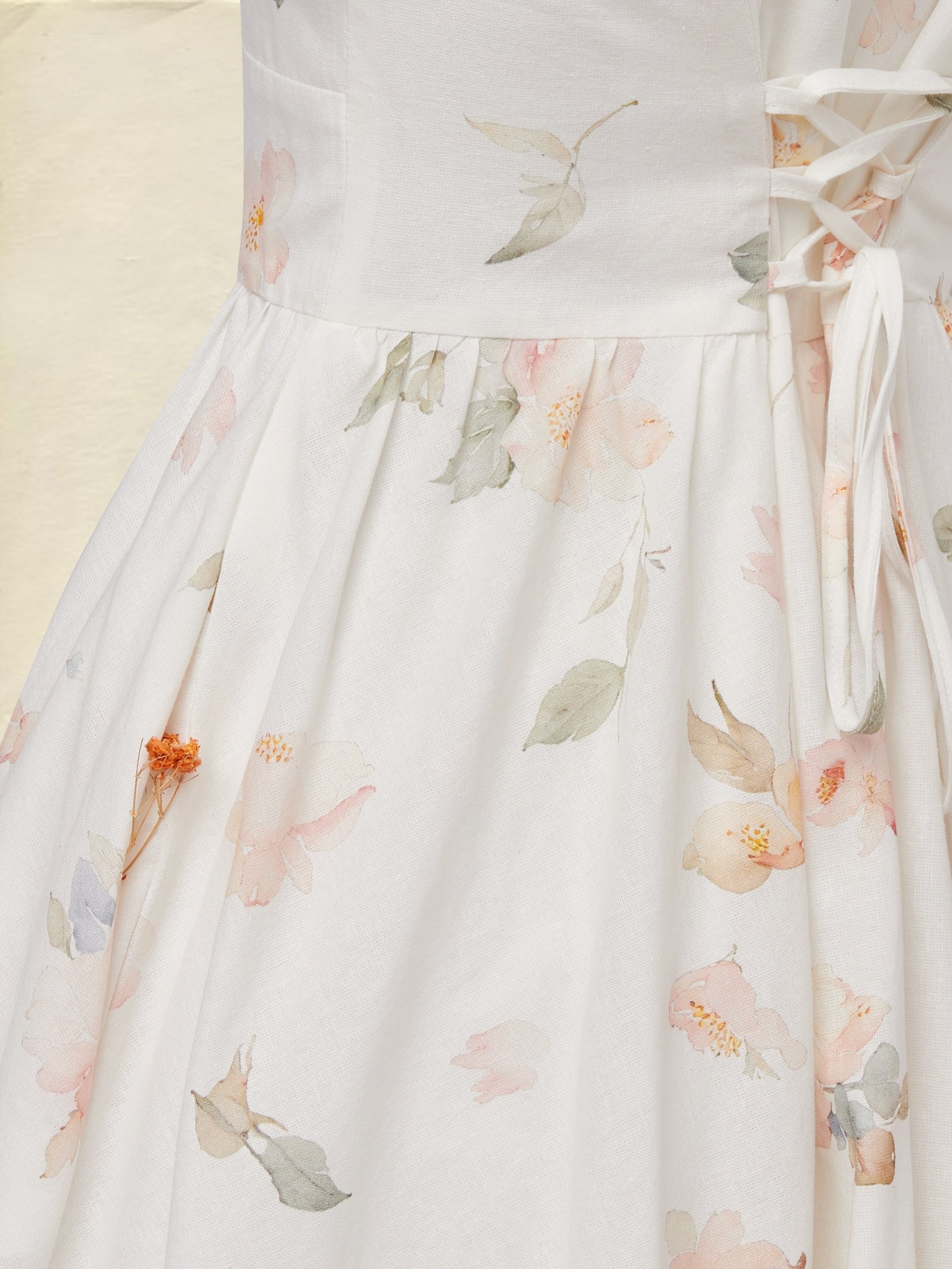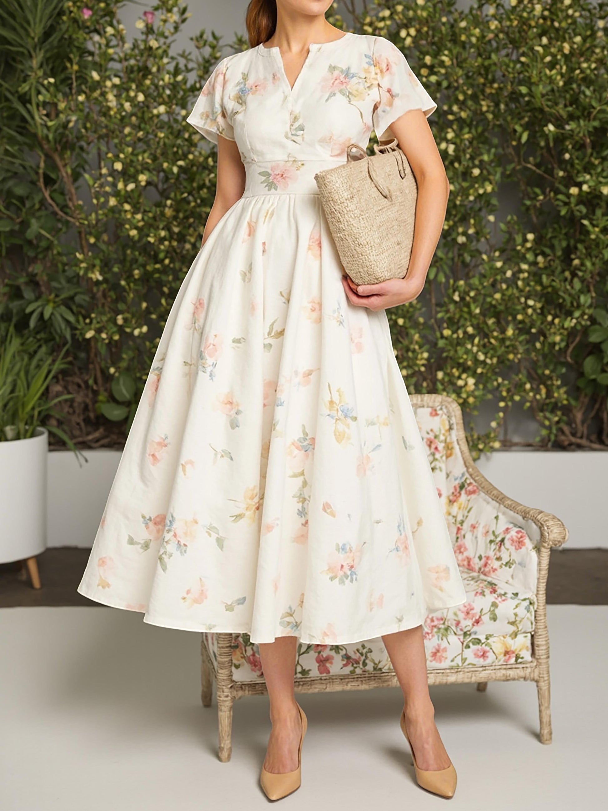 Midi Linen Dress, Short Sleeves, V Neck, Floral, Vintage, White