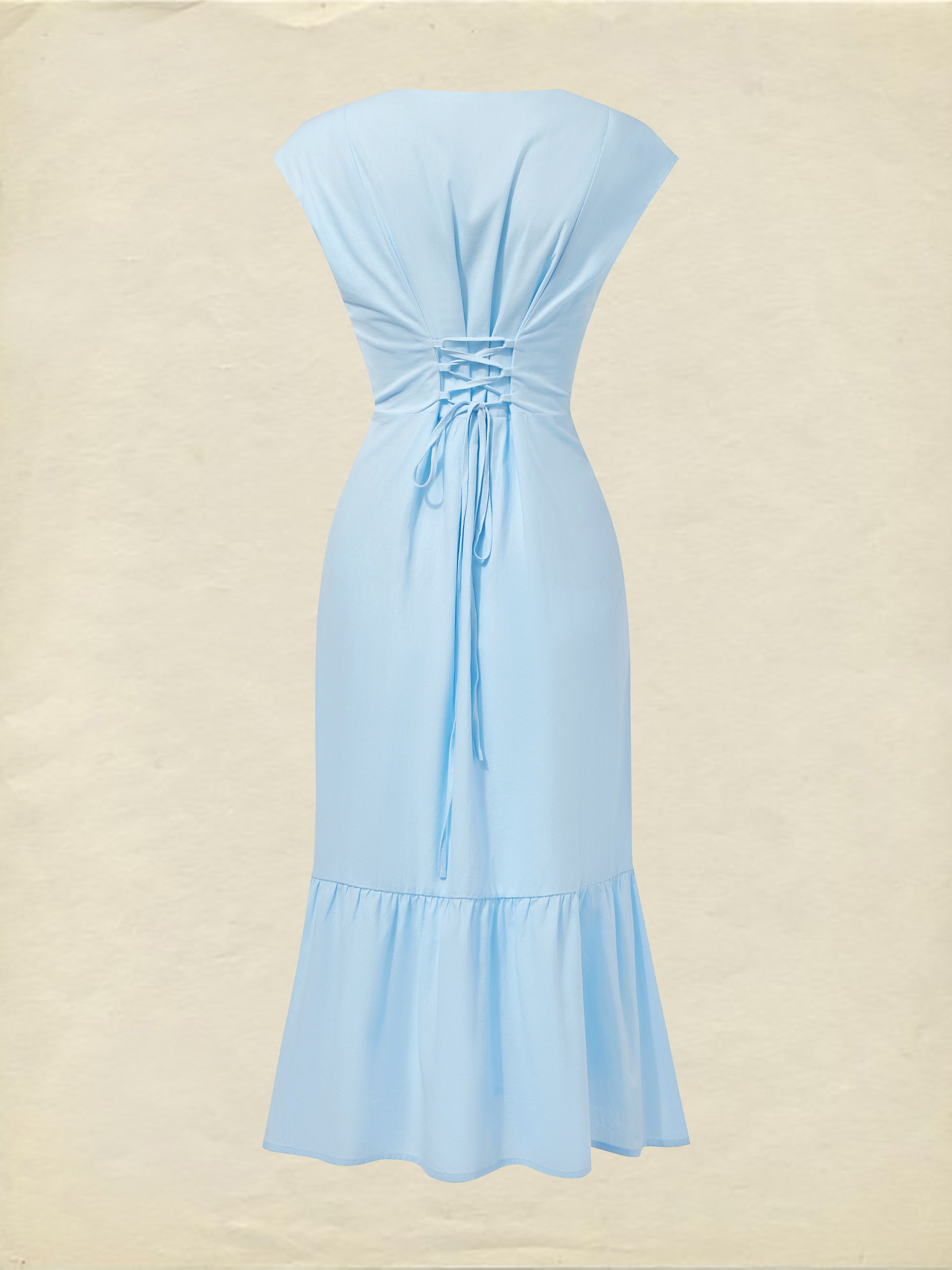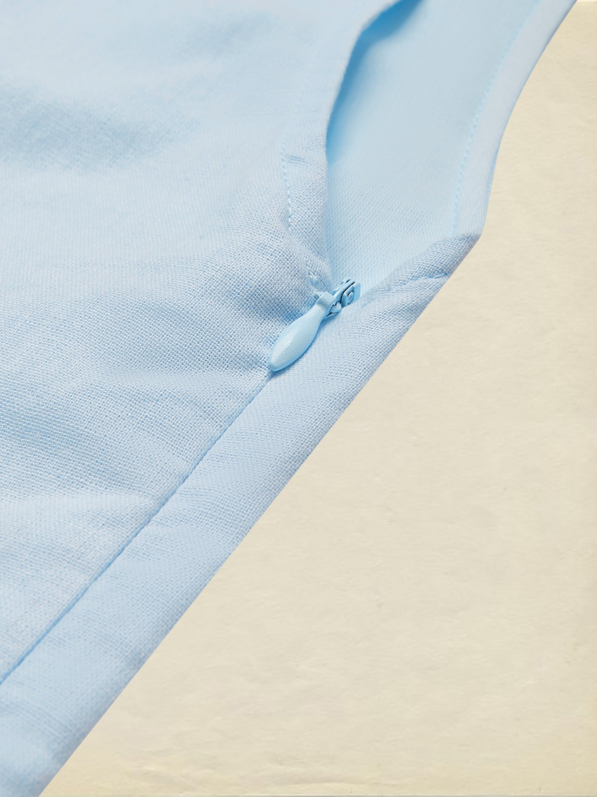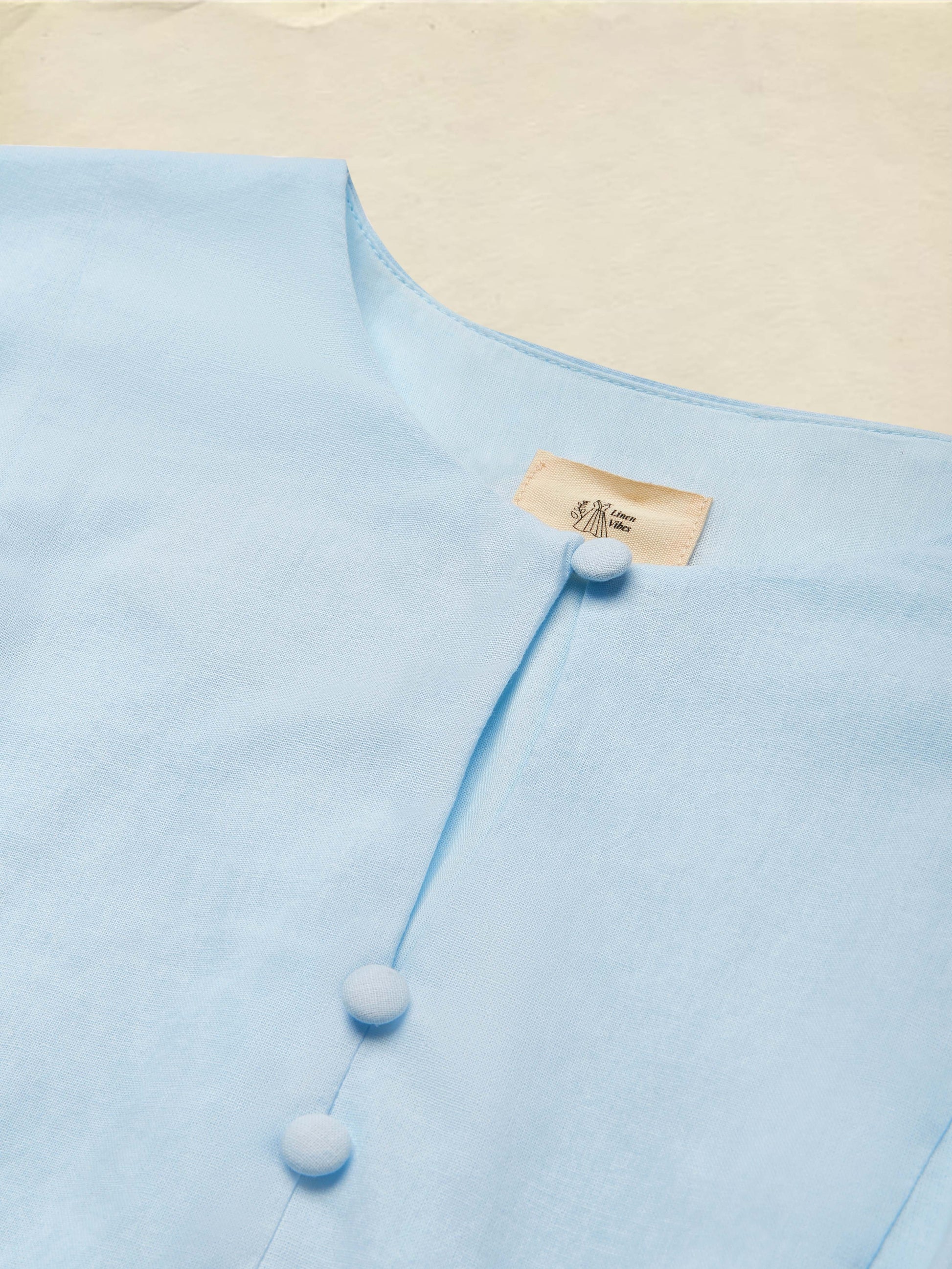 Midi Linen Dress, Crew Collar, Cap Sleeve, Button Down, Cottagecore, Linen Blend, Blue