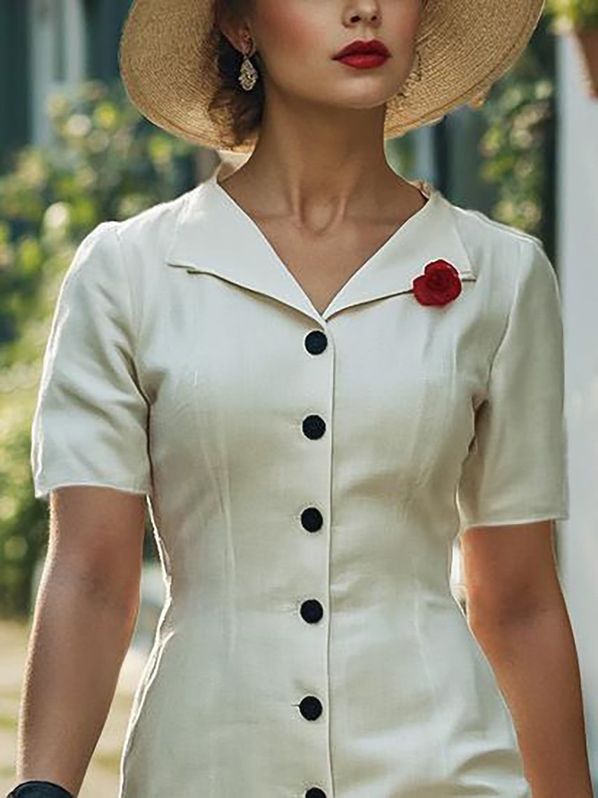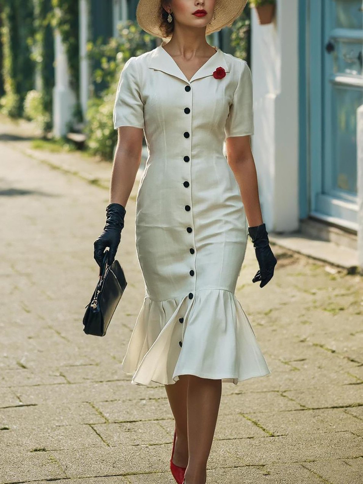 Midi Cotton Dress, Short Sleeve, V Neck, Linen Blend, Plain,White